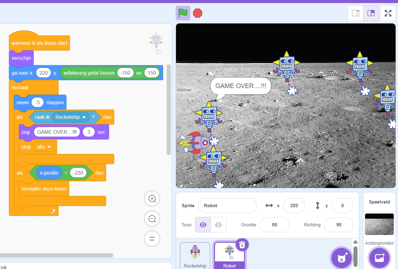 De kinderen werken aan een spel waarin een raket allerlei robots moeten ontwijken die over het scherm vliegen. De lesmethode Programmeren met Scratch neemt de leerlingen stap-voor-stap mee. In deze fase is het nog een kwestie van voordoen en nadoen. De exacte werking is nog niet belangrijk. Aan bod komen: herhaallussen, als-dan-loops, percentages en coördinaten. Wat tandwielen en assen zijn voor lego, zijn lussen, loops en coördinaten voor Scratch.
