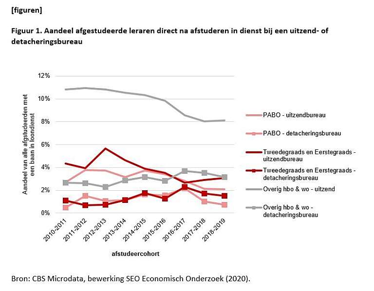 Vorig jaar toonden de cijfers nog dat steeds meer pas afgestudeerde leraren voor de klas stonden via een detacheringsbureau (zie Flexen in tijden van tekort, Didactief, april 2019). Maar die trend buigt nu de andere kant op: het aandeel leraren dat na afstuderen aan de slag gaat via een detacheringsbureau is de afgelopen twee jaar gedaald, vooral onder pabo-afgestudeerden (zie figuur 1). Leraren die na hun afstuderen wel in zo’n constructie voor de klas staan, gaan daarna meestal alsnog in dienst bij een school. Aan de andere kant neemt wel het aandeel zzp-leraren in het primair onderwijs toe.