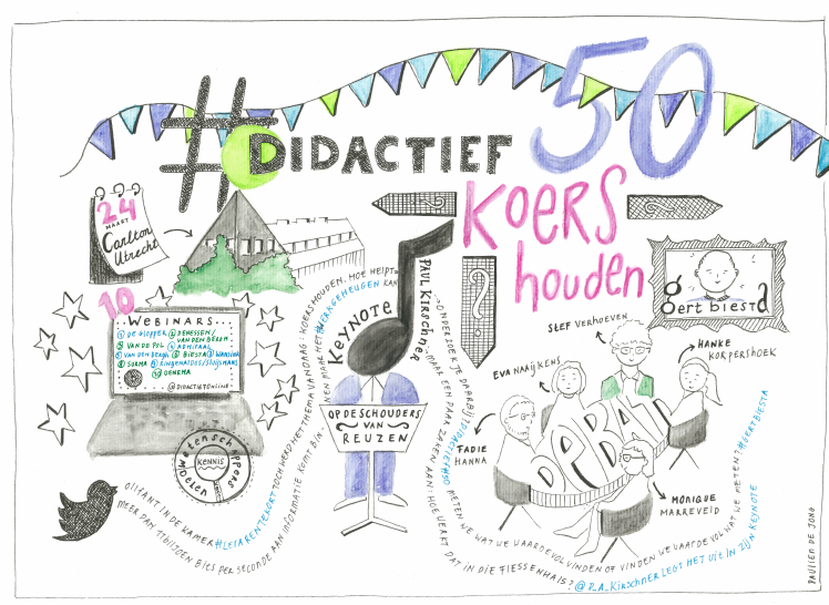 De hotelzaal die een heuse tv-studio werd vol lampen en camera’s (foto 2 en 4) bleef hermetisch dicht tijdens de live-gedeelten, met de keynote van Paul Kirschner (1) en het rondetafeldebat (5). In de aangrenzende lobby werden de gasten verwelkomd en stond de Didactief-redactie aan laptops gekluisterd. Om evenals de congresdeelnemers het programma online te volgen (en ja, met flinke zenuwen toen de techniek haperde), maar ook de chat te modereren en verslag te doen op Twitter. En wat maakte #Didactief50 een hoop reacties los! Ook op afstand bleek iedereen verrassend dichtbij. Onze specials-redacteur Paulien de Jong maakte er een levendige beeldcolumn (3) van.