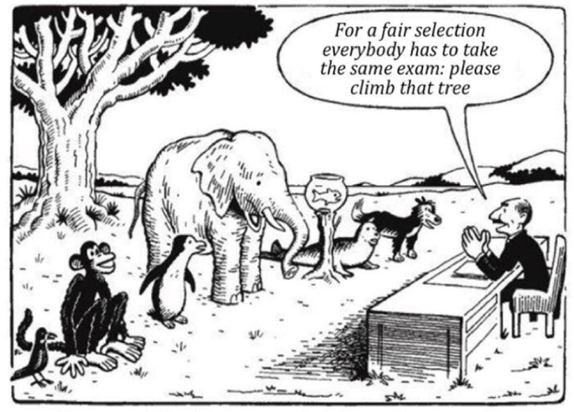 De afgelopen jaren kwam ik in het onderwijs op talloze prikborden dezelfde cartoon tegen. Een vogel, aap, pinguïn, olifant, vis, zeehond en hond staan op een rijtje opgesteld voor een boom. Ze luisteren naar een menselijke examinator, die de dieren vanachter zijn bureau toespreekt: ‘Voor een eerlijke selectie moet iedereen hetzelfde examen afleggen: klimt u alstublieft in die boom’.