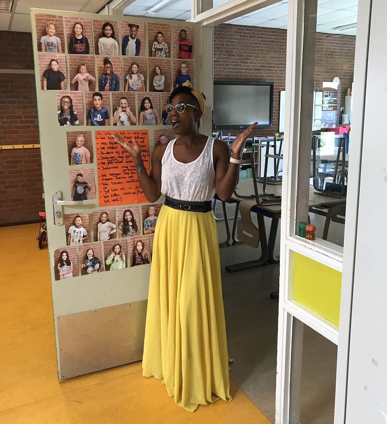 De finalist voor Leraar van het jaar 2021, Angela Esajas (43), zit in de hal voor het lokaal van haar groep 5/6. ‘Nog héél even een mail afmaken hoor,’ zegt ze terwijl ze spontaan haar hand uitsteekt. ‘Een elleboog, een hand? Het maakt mij niets uit.’ Sinds corona kan ze trouwens ook de ‘voetboks’, een idee van een leerling, lacht ze. Contact hebben met elkaar, het is een eerste levensbehoefte voor de energieke Esajas die elk schooljaar streeft naar een goede relatie tussen een leerling, de ouders en haarzelf. Ze voert met élke ouder een gesprek, ook in gebrekkig Engels, of er komt een tolk mee. Ouders...