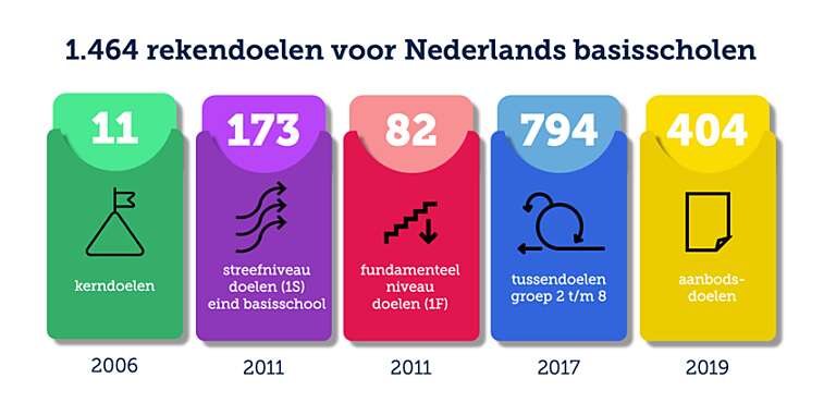 Nederlandse basisscholen krijgen maar liefst 1.464 rekendoelen op hun bord: 11 kerndoelen, 173 streefdoelen, 82 fundamentele doelen, 794 tussendoelen en 404 aanbodsdoelen.